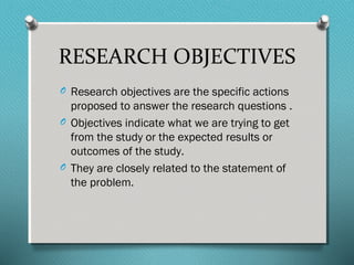 This document discusses research objectives and their characteristics. It explains that research objectives clearly and specifically state what the researcher aims to achieve through their study. Objectives should be achievable and help answer the research questions. There are general objectives that broadly state what the study aims to achieve overall. Specific objectives are more narrow and divided into exploratory, descriptive, and explanatory phases. Exploratory objectives explore principles or aspects of the topic, descriptive objectives characterize and describe relationships and parts, and explanatory objectives discover causes and origins.