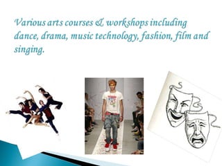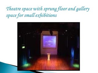 The document provides information on several local media and arts venues in East London, including the Brady Arts Centre, Rich Mix arts centre, Chisenhale dance space, Bangla TV, and Stratford Theatre Royal. Rich Mix hosts a variety of events from film screenings and live music to workshops and exhibitions celebrating local cultural diversity. The Stratford Theatre Royal is a historic theatre located in Stratford showing plays and operas.