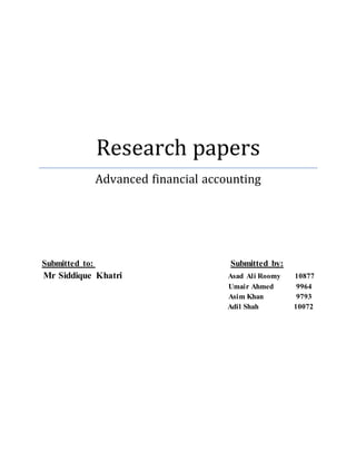 The document discusses International Financial Reporting Standards (IFRS) and accounting principles, regulations, and standards. It provides an introduction to IFRS and discusses their origins and adoption in different countries. It then summarizes criticisms of IFRS, Pakistan's adoption of various IFRS, accounting standards used in different institutions, and basic objectives and concepts of financial accounting standards like GAAP.