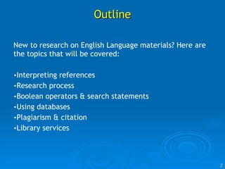 This document provides an introduction to conducting research on English language and linguistics topics. It covers interpreting references, the research process, using Boolean operators and search statements, databases for linguistic research, plagiarism and citation styles, and library services. Key databases mentioned for linguistic research include Linguistics and Language Behavior Abstracts and Factiva. The research process outlined begins with defining a topic and keywords, constructing searches, and locating and evaluating sources.