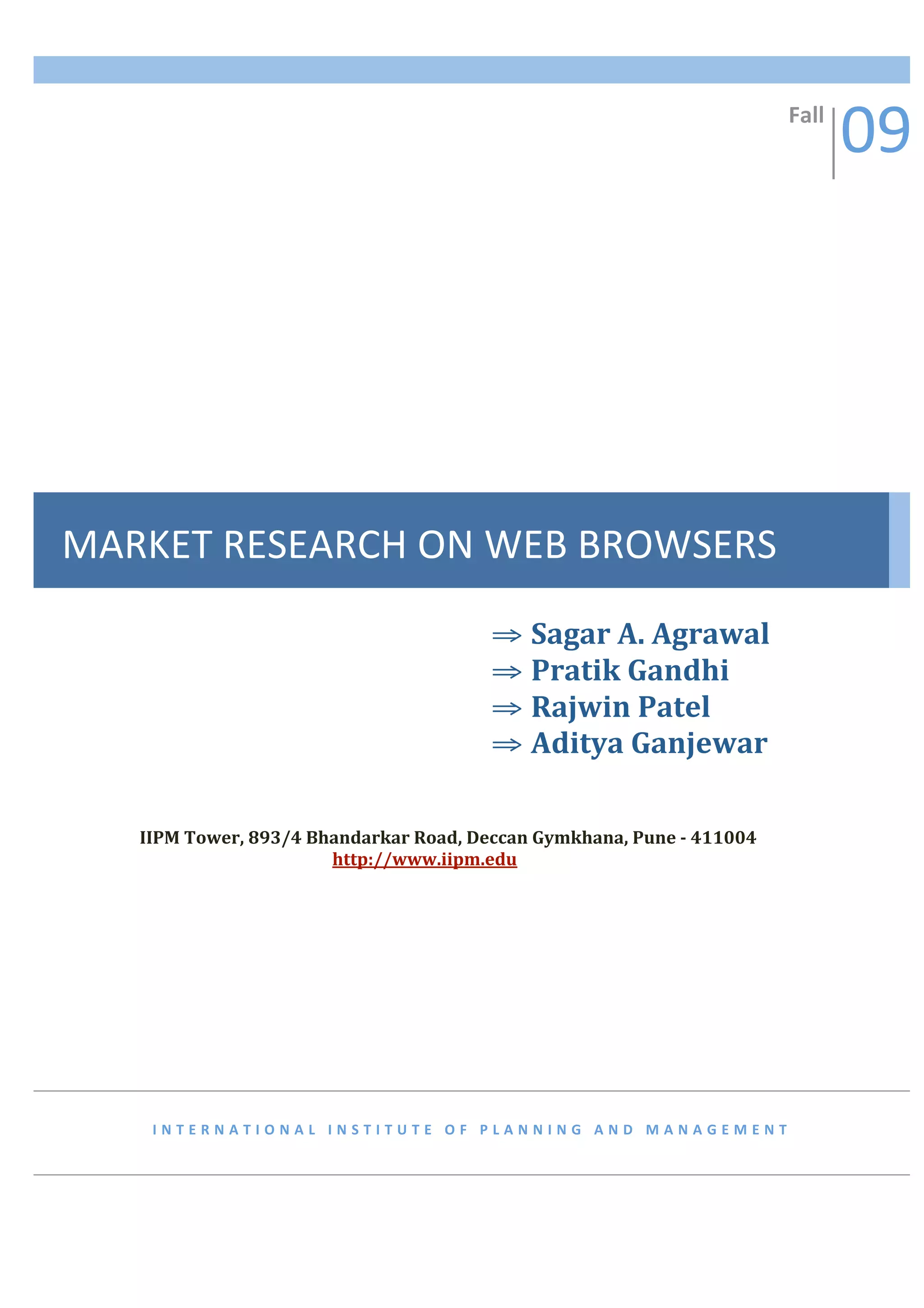 The document describes a market research methodology used to study web browsers. It involved conducting in-person interviews at computer shops and multiplexes, as well as an online questionnaire. The interviews focused on what users like and dislike about current browsers to help identify areas for improvement. Students and computer shop workers were the main target groups, as they represent a range of ages and browser experience levels. The goal was to gather qualitative user feedback to better understand user needs and inform the design of new browser features.