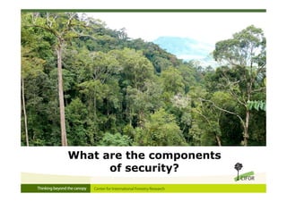 The document examines components of tenure security, including perceptions of security and the ability to exclude unwanted users from village lands. It highlights the significance of understanding conflicts and insecurity related to land use, along with the community's perspective on their rights. A structured questionnaire is outlined to gather insights on tenure security and exclusion rights within specific village contexts.