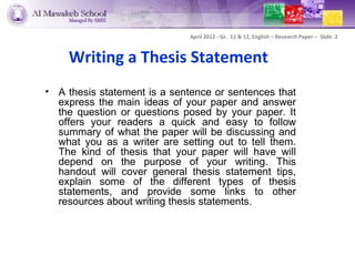 The document provides guidance on writing a research paper, including how to write a thesis statement, introduction, and bibliography. It explains that a thesis statement should express the main ideas and answer any questions posed. Body paragraphs should develop the thesis in a unified, coherent manner with adequate details. Specific tips are provided on writing expository and argumentative thesis statements and introducing sources in a bibliography.