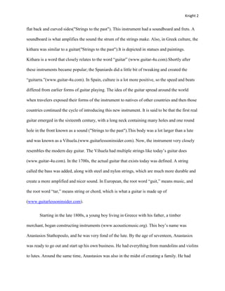The document traces the evolution of the acoustic guitar from its origins thousands of years ago to its widespread popularity and cultural impact today. It discusses early instruments that preceded the modern guitar, like the lute and kithara. The guitar continued developing over centuries as it spread across cultures. Today, the acoustic guitar remains deeply influential across many genres of music and has never lost its appeal despite technological changes, demonstrating its power to inspire emotions. Famous musicians like Dave Matthews still rely heavily on the acoustic guitar to create music. The guitar has evolved as different societies have shaped it but continues to influence individuals and cultures in a mostly positive way.