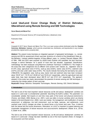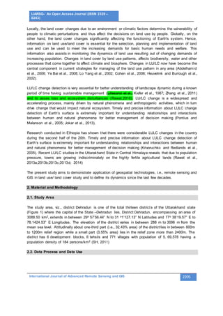 This document describes a study that used remote sensing and GIS techniques to analyze land use/land cover change in Dehradun District, India over a 22-year period from 1994 to 2016. Landsat satellite images from 1994, 1999, and 2016 were classified into six land use/land cover classes: vegetation, agriculture, built-up, barren, sediment, and water. The results found increases in vegetation, built-up, barren and sediment areas, and decreases in agricultural land and water bodies. The approach demonstrated the potential of remote sensing and GIS for measuring and understanding land use/land cover change dynamics over time.