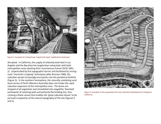 This document discusses topographically sensitive urbanism and re-envisioning earthwork terracing in suburban development. It summarizes how some cities like Hong Kong, Rio de Janeiro, Sydney, and San Francisco have responded to steep topography with site-specific strategies that integrate the natural terrain. However, at expanding city peripheries, suburban sprawl is increasingly encroaching onto hilly areas and re-grading natural slopes into flat terraced lots, disrupting the balance between urban form and topography. The document examines how prevailing 20th century urban models of modernism, ecological planning, and traditional urban design have had limited influence over this process of mechanized suburban transformation on sloped lands.
