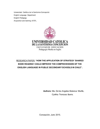 This document summarizes a research paper about using the strategy of shared book reading to improve English reading comprehension among students in public secondary schools in Chile. It finds that 86% of Chileans do not understand what they read and students from lower income families have less reading abilities. While students are expected to reach an B1 English level, 2012 test results show students are below an A1 level. The paper reviews literature on contextualizing reading instruction and defines reading comprehension as extracting and building meaning from text. It describes the origins of shared book reading and its key elements: the reader, the text, and the reading activity. The strategy aims to improve comprehension by considering students' interests and socio-cultural context. In conclusion, many students
