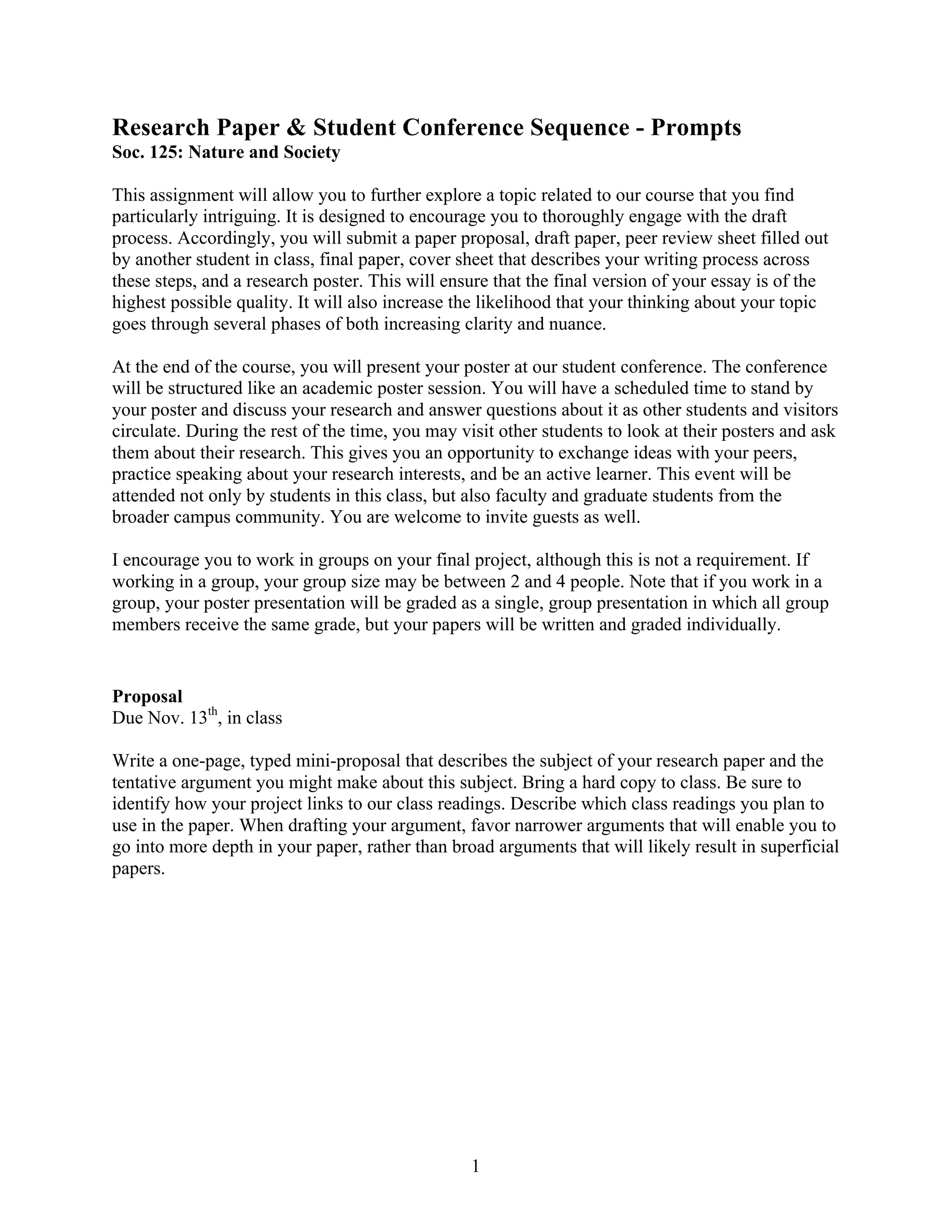The document outlines a comprehensive assignment for a sociology course that involves the development of a research paper and presentation poster. Students are required to submit a proposal, draft, peer review, final paper, and a research poster, culminating in a student conference presentation. The assignment emphasizes engagement with course materials, group collaboration, and the application of a structured writing process to enhance research quality and clarity.