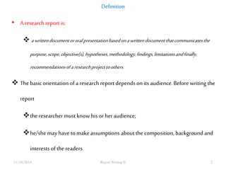 This document provides guidelines for writing effective research reports. It defines a research report and outlines its basic structure, which typically includes sections for an abstract, introduction, literature review, method, results, discussion, and conclusion. The document emphasizes writing concisely and precisely for the intended audience, using fair and unbiased language, and structuring the report in a way that tells an interesting story about the research.