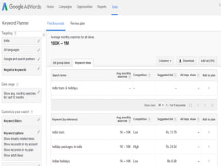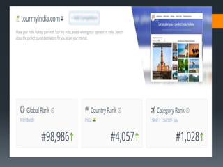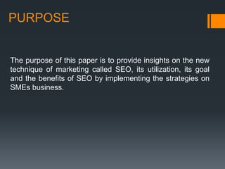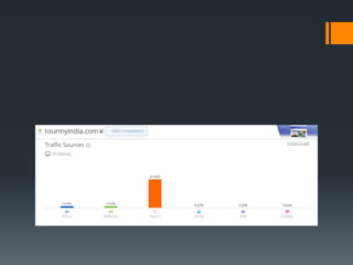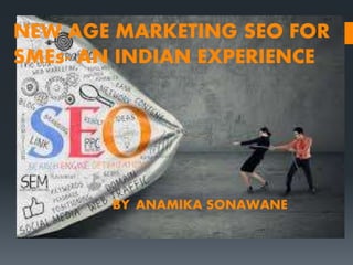 This document discusses how SEO can help small and medium enterprises (SMEs) in India with digital marketing. It provides an introduction to SEO and its benefits. A case study is presented on an Indian travel company called Tour My India that saw increased traffic and rankings after implementing an SEO strategy. This included analyzing the site's performance, defining user personas, competitors, and a marketing approach. The conclusion is that SEO helps SMEs stand out, increases site visibility, is cost-effective, and brings more customers through the door when done properly by managing content, keywords, and link building.