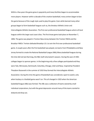 Dr. James Naismith invented the game of basketball in 1891 while working at Springfield College in Massachusetts. He was tasked with creating an indoor winter game and came up with 13 original rules. The first official game was played in December 1891 between two teams of 9 players each, using a soccer ball and peach baskets as hoops. The game grew rapidly in popularity over the following decades as more colleges, amateur leagues, and eventually professional leagues were formed. However, the professional leagues of the early 20th century struggled for longevity due to financial difficulties. The modern game continued developing structures and growing its fanbase throughout the 1900s.