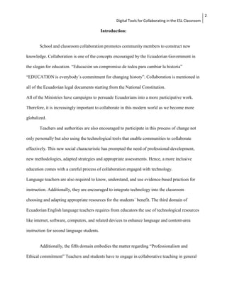 This document discusses digital tools for collaborating in ESL classrooms. It begins by explaining that collaboration is emphasized in Ecuadorian education policy and standards. It then reviews literature showing that collaboration promotes knowledge construction, and digital tools can support collaboration through asynchronous and synchronous interactions. The document discusses constructs of collaboration and cooperative learning, and proposes that digital tools allow language learning to take place through social interaction. It reviews specific digital tools like discussion boards, email exchanges, and computer-assisted language learning programs that have been shown to improve language skills through collaborative online activities. Finally, it discusses elements of effective online collaboration, including establishing roles, accountability, and providing structured guidance and feedback.