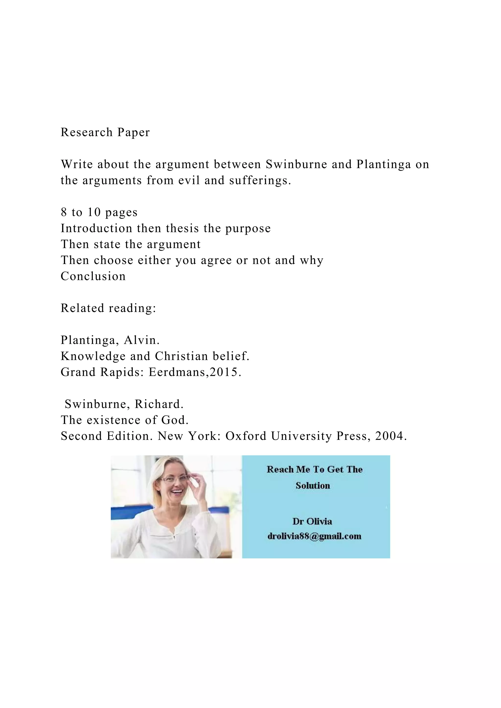 The document outlines a research paper addressing the debate between Swinburne and Plantinga regarding the problem of evil and suffering. It includes an introduction, a thesis statement, an exploration of the arguments, and requires a position to be taken, along with a justification. Related readings include works by Alvin Plantinga and Richard Swinburne.