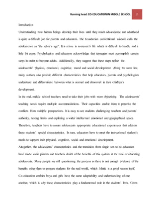 This document discusses co-education in middle school and how adolescents develop physically, cognitively, and socially during this transition period. It provides an overview of typical physical characteristics in early adolescence such as growth spurts and changes in sexual maturity. Cognitive development involves a shift from concrete to more abstract thinking, though attention spans remain short. The implications for teaching include providing health programs to help students adapt, designing lessons that are short but engaging, and encouraging intrinsic motivation through differentiated instruction. Overall, the document examines how middle school environments can best support students' development across this stage of life.