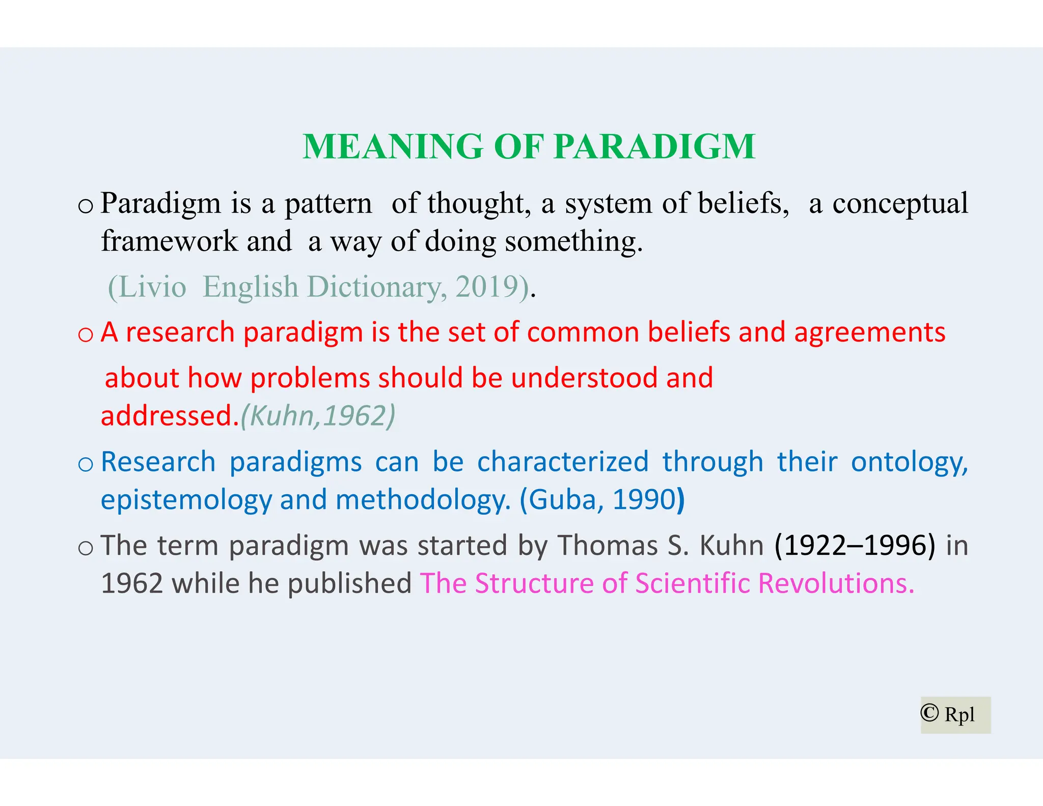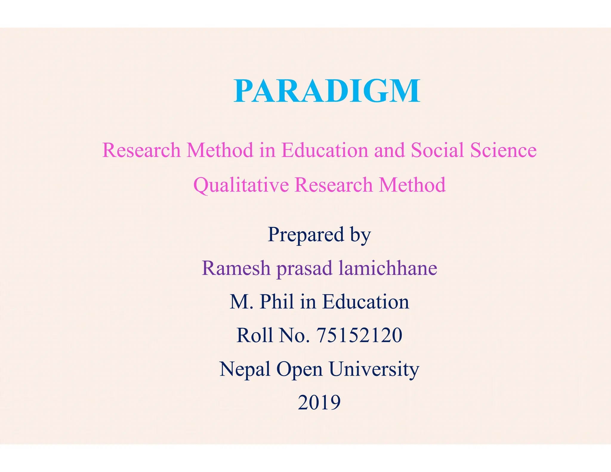 This document discusses research paradigms in qualitative research. It defines a paradigm as a framework or set of beliefs that guide research. The key paradigms discussed are positivist, constructivist, transformative, and pragmatic. The document explores the basic components of a paradigm including ontology, epistemology, axiology, and methodology. It examines the characteristics and assumptions of different paradigms such as the positivist view that there is a single observable reality, and the constructivist view that realities are socially constructed. The document also discusses types of paradigms for social theory analysis including functionalist, interpretive, radical humanist, and radical structuralist.