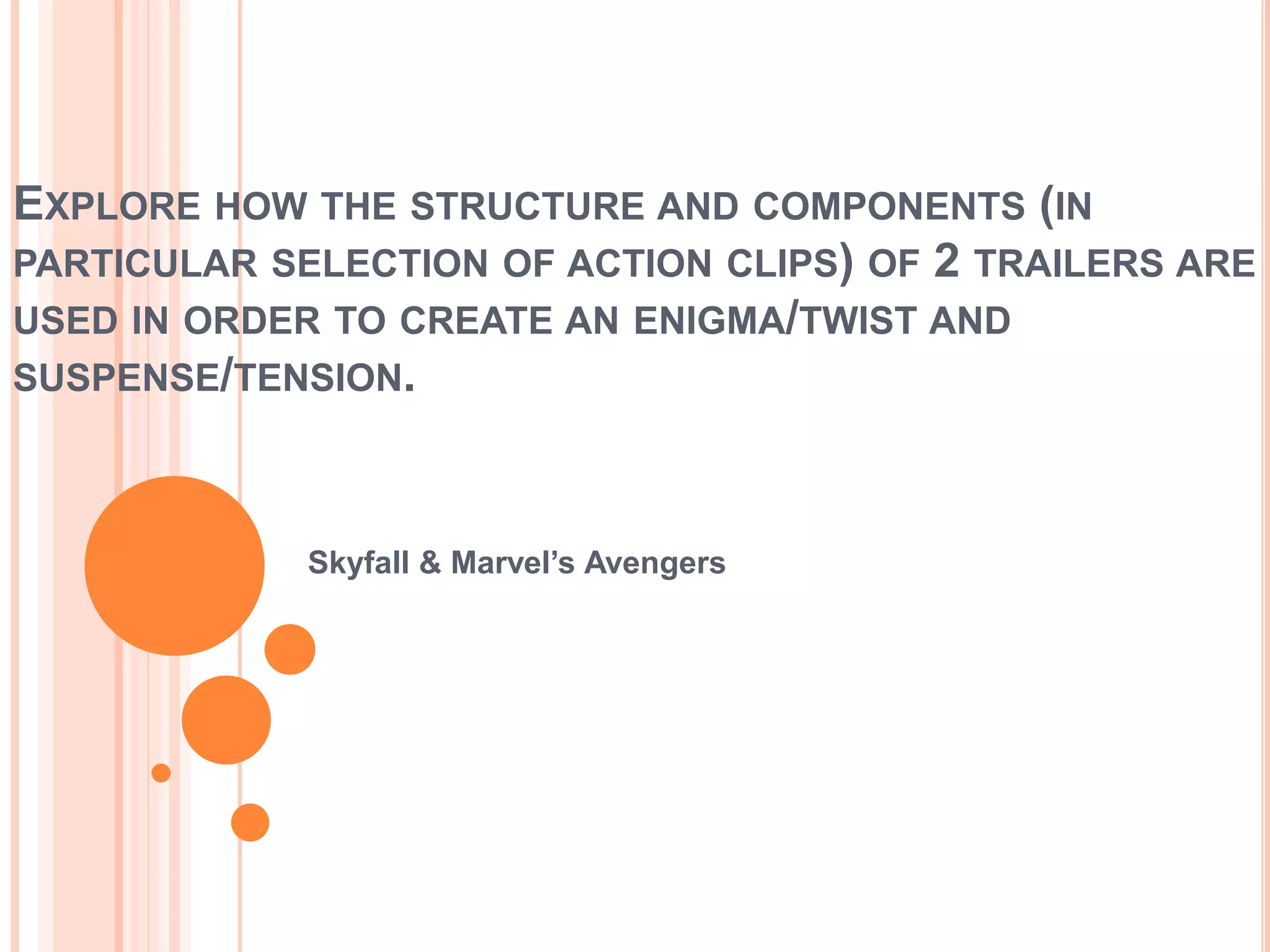 The document analyzes how two movie trailers, Skyfall and The Avengers, create suspense through their selection and ordering of action clips. For Skyfall, the trailer introduces tension immediately by showing Bond getting shot and falling to his death, creating an unexpected twist. It contrasts dark, tense scenes for Bond with brighter scenes when he is absent, building tension until he teams up with M. For The Avengers, the trailer starts with ominous sounds and scenes before cutting to shots of police shooting mysteriously at the sky, building mystery. It then shows the villain before cutting to action clips of the heroes together, promising excitement through continuity editing and fast-paced shots. Both trailers effectively employ techniques like unexpected twists, contrasts in