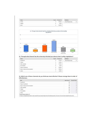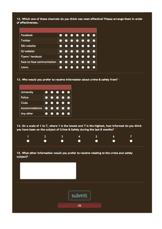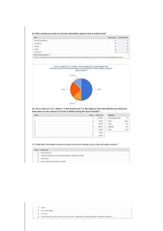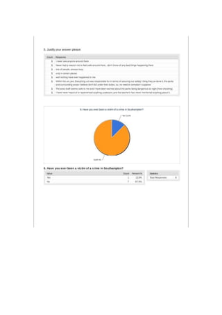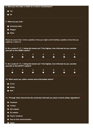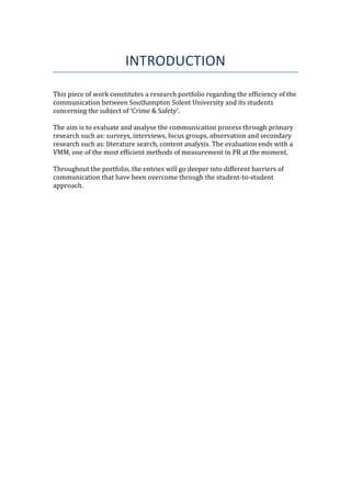 This document provides a summary of a research portfolio analyzing the communication between Southampton Solent University and its students regarding crime and safety. The portfolio includes a literature review on this topic from academic databases, journals, and books. It then performs a content analysis of the university's "Student Survival Guide" on crime and safety from the student perspective. Finally, it describes a survey distributed to Southampton Solent University students to understand their views on communication with the university about crime and safety issues. The survey aims to get responses from a random sample of at least 50 students using self-selection sampling. It includes both qualitative and quantitative questions to gather numerical data as well as student opinions.