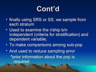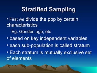 Stratified sampling involves dividing the population into subgroups or strata based on key characteristics. Samples are then selected from each strata using simple random or systematic sampling. This technique is used to examine relationships between variables, make comparisons among subgroups, and reduce sampling error. Sample size depends on heterogeneity, with larger samples reducing sampling error.