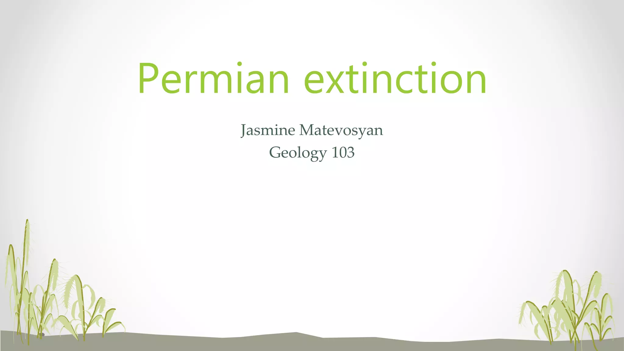The document summarizes information about the Permian extinction event that occurred approximately 252 million years ago. It describes the extinction of over 90% of species on land and sea, including synapsids, sauropsids, ammonites, brachiopods, sharks, and rays in the seas as well as insects and reptiles on land. Potential causes that are discussed include severe volcanism, environmental changes from the formation of the supercontinent Pangaea, asteroid impact, or a combination of these factors. However, the exact cause remains unclear due to lack of evidence over the past 250 million years.