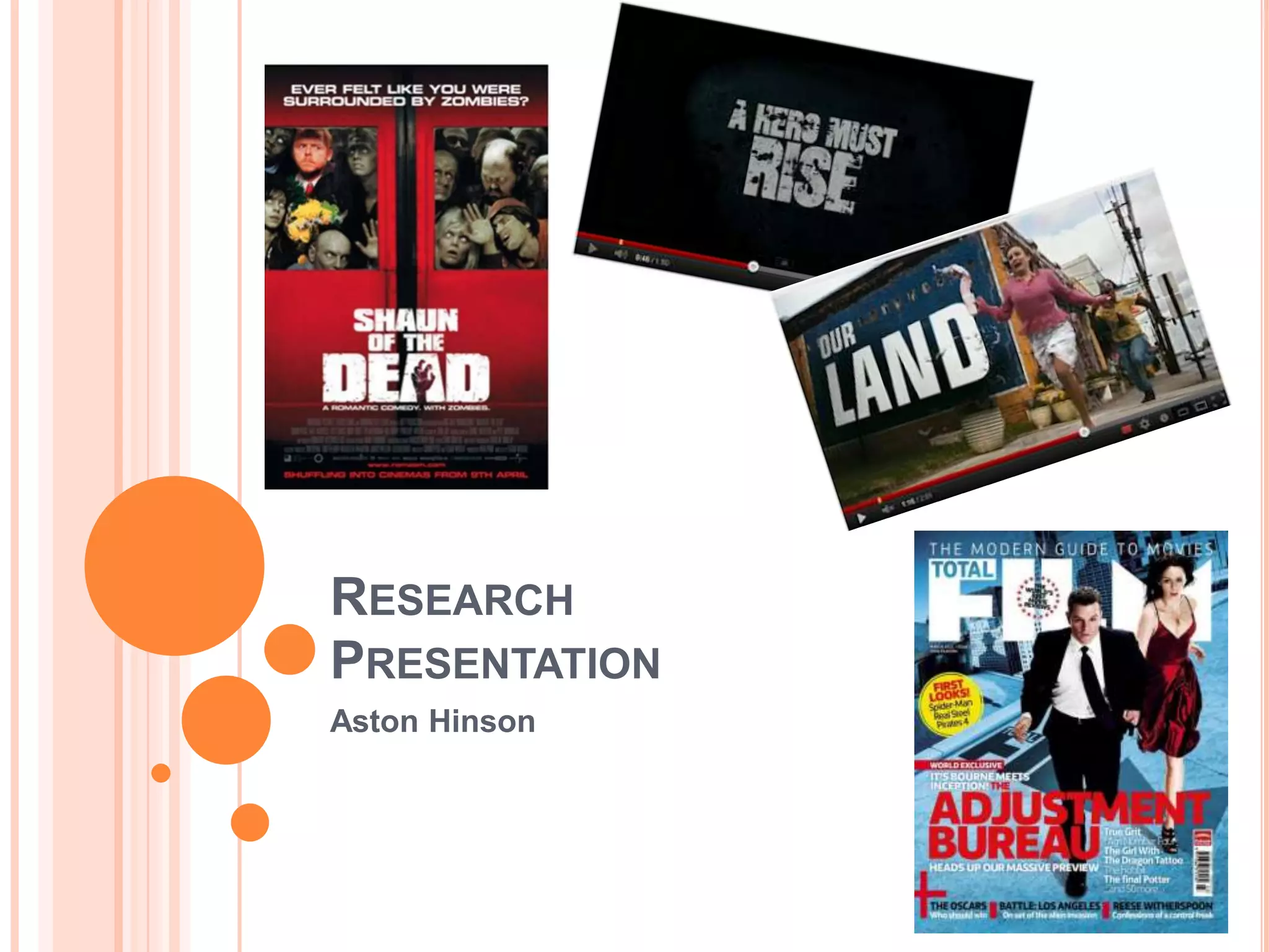 Aston Hinson has researched similar horror-comedy trailers, posters, and magazine covers to understand conventions. Audience research found the target audience wants humor and uses social media. This research will help plan and produce a successful trailer, poster, and magazine cover by including scenes, characters, humor, and marketing through social media sites to appeal to the target audience.