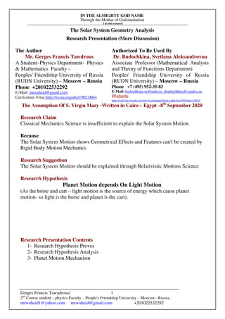 Gerges Francis Tawadrous presents a research analysis on the geometry of the solar system, arguing that classical mechanics cannot adequately explain planetary motion, which he claims is influenced by the properties of light. The research proposes a new model of planetary motion that aligns with geometrical principles, enabling a deeper understanding of matter and space proportionality. It also touches on the movement of Mars due to historical collisions with other planets, suggesting that orbital distances relate to planet diameters.