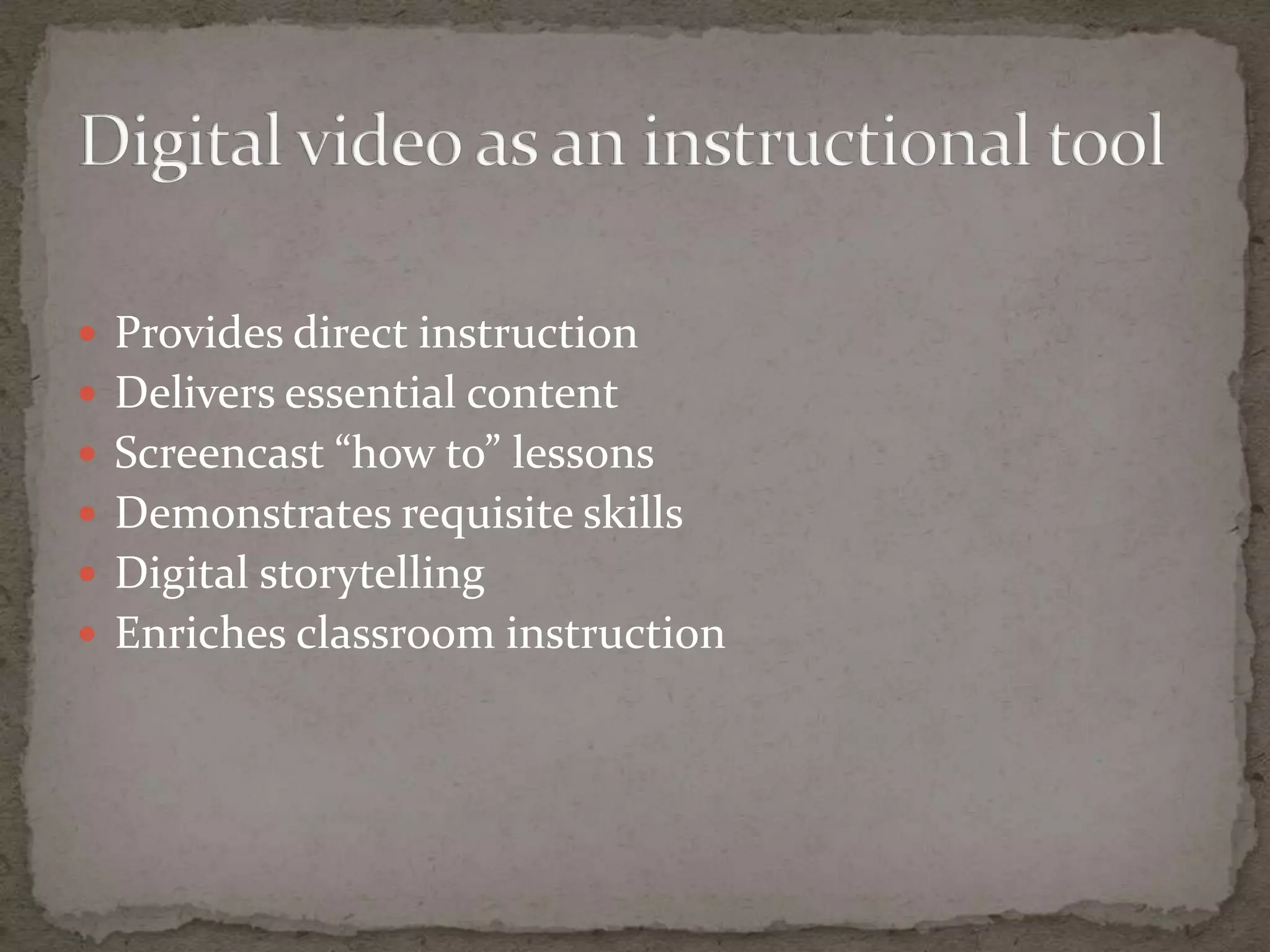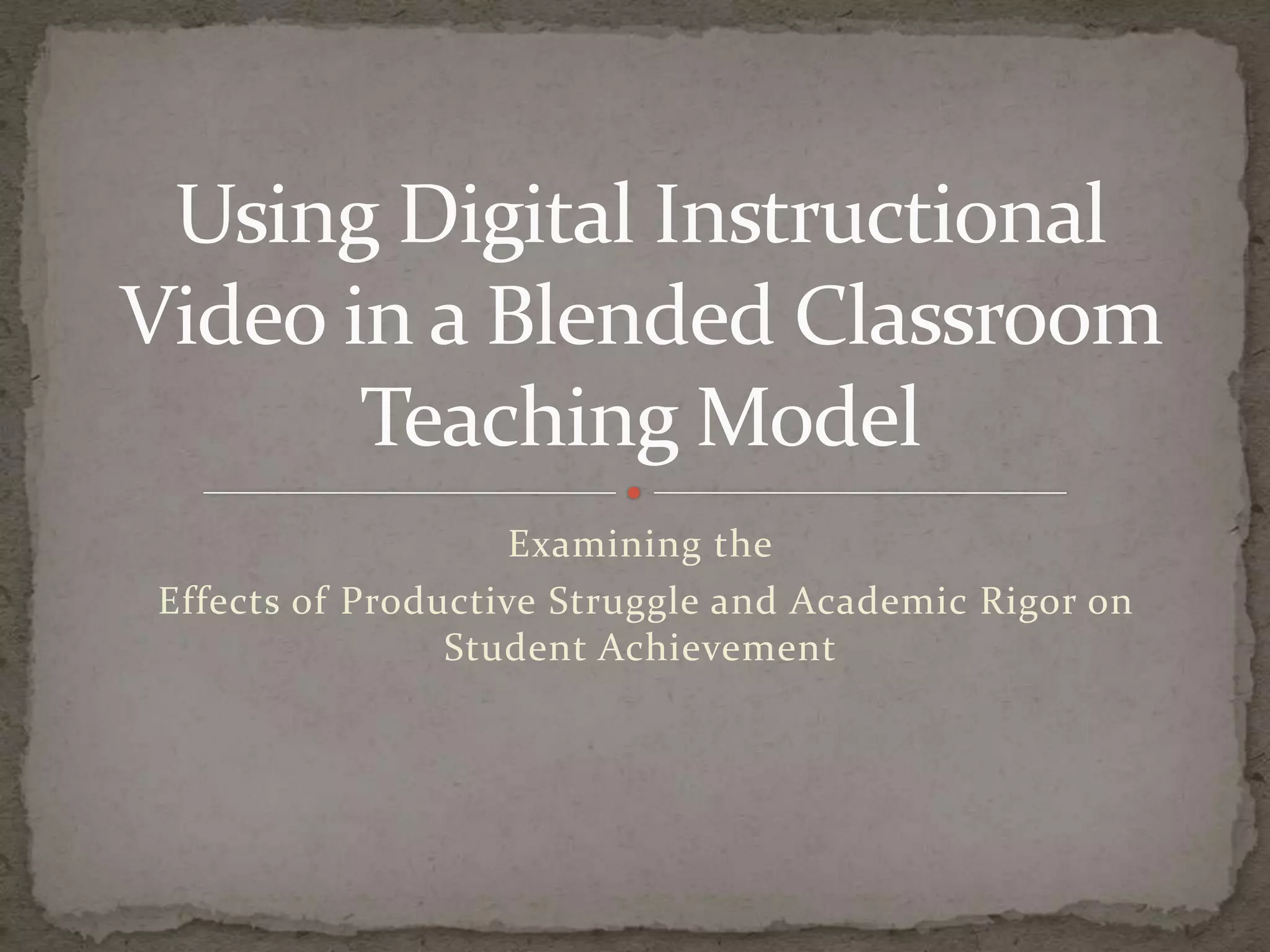 This document discusses strategies for incorporating digital video into classroom instruction in a way that promotes productive struggle and academic rigor. It argues that most instructional videos simply replicate passive lectures, rather than giving students opportunities to grapple with problems and build their own understandings. To be effective, videos should incorporate sound instructional design principles and introduce elements of productive struggle that require higher-order thinking from students. The goal should be helping students learn to think for themselves, not just demonstrating skills to replicate.