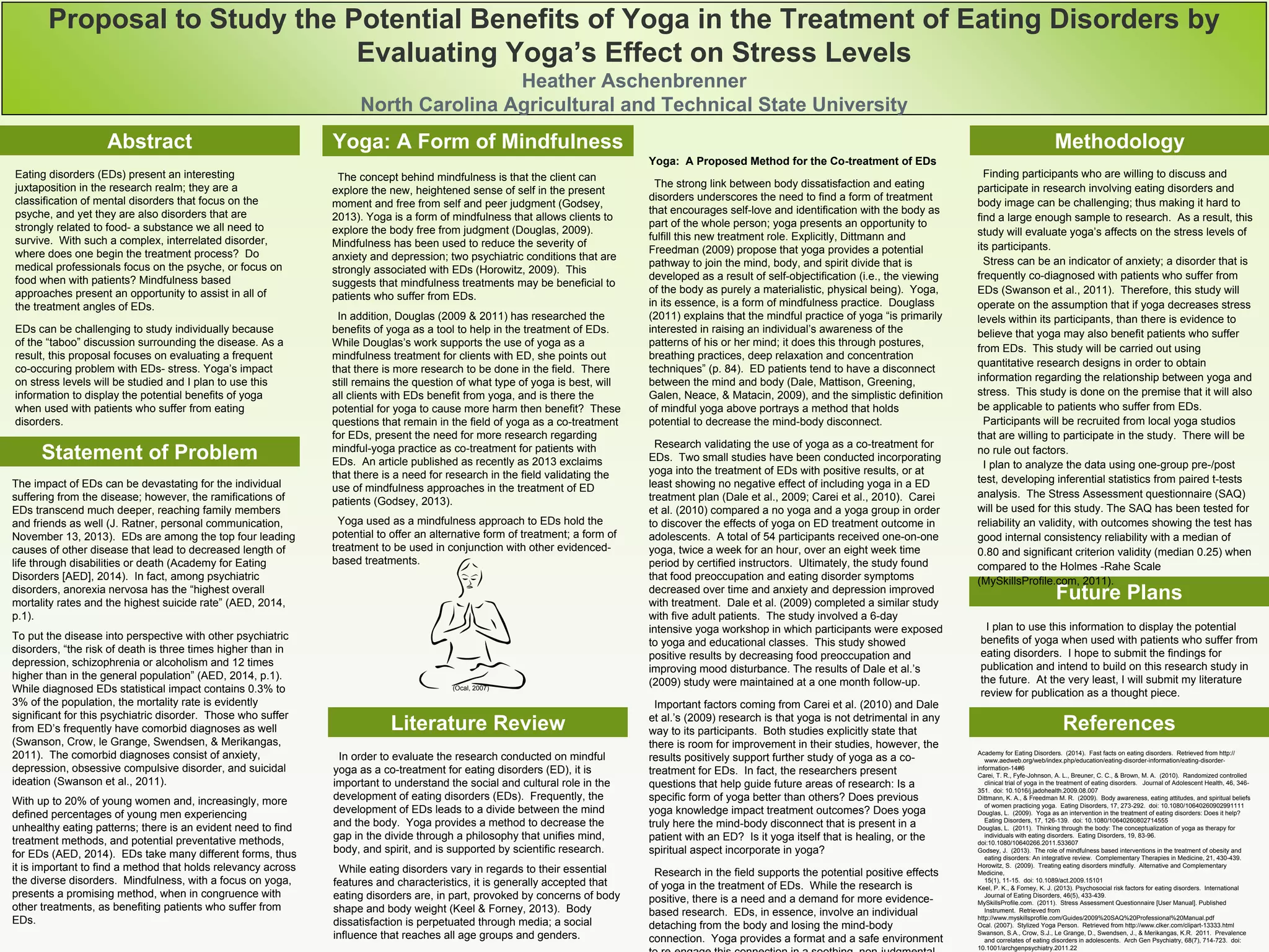 This proposal suggests studying the potential benefits of yoga in treating eating disorders by evaluating its effects on stress levels. It hypothesizes that since stress is commonly co-occurring with eating disorders, reducing stress through yoga may also benefit eating disorder patients. The study would recruit local yoga studio participants and use a pre-/post-test design to analyze if yoga decreases stress scores. If successful, it provides preliminary evidence that yoga may help address the disconnect between mind and body experienced by many with eating disorders.