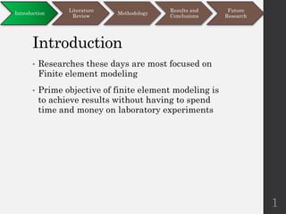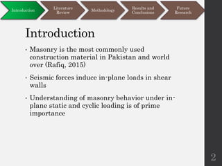 This document discusses different modeling approaches for finite element analysis of masonry structures. It compares the springs modeling approach and expanded units modeling approach by applying them to numerically model and analyze the behavior of four experimental masonry walls under various static and pseudo-dynamic loading conditions. Both approaches are able to predict the load capacities of the walls with reasonable accuracy compared to experimental data, but the expanded units approach is found to be more versatile and accurate. The document also outlines future research directions around improving the accuracy and capabilities of the modeling approaches.