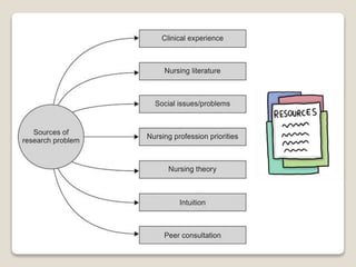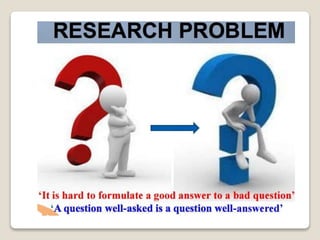 This document discusses the identification and formulation of research problems. It begins by defining a research problem and noting that identifying a problem is the first step of the research process. It then discusses several potential sources that a research problem may come from, such as personal/practical experiences, literature reviews, previous research, theories, and social issues. The document also outlines criteria for selecting a good research problem, including significance, originality, feasibility, being solvable, being current, and being interesting to the researcher. It concludes by outlining the process of formulating a research problem from selecting a broad topic area to delimiting the topic and evaluating and stating the problem.