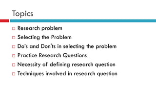 The document discusses the process of selecting and defining a research problem, emphasizing the importance of clarity, focus, and complexity in formulating research questions. It outlines guidelines for selecting a problem, the necessity of a preliminary study, and techniques for defining a problem, including literature review and discussions with knowledgeable individuals. Additionally, it highlights the significance of a clearly stated research problem in successfully conducting research.