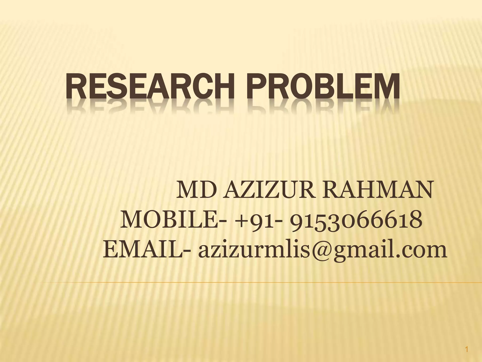 2. A research problem is a question a researcher wants to answer or a problem they want to solve. It is the first step in the research process. Without a problem, research cannot proceed.