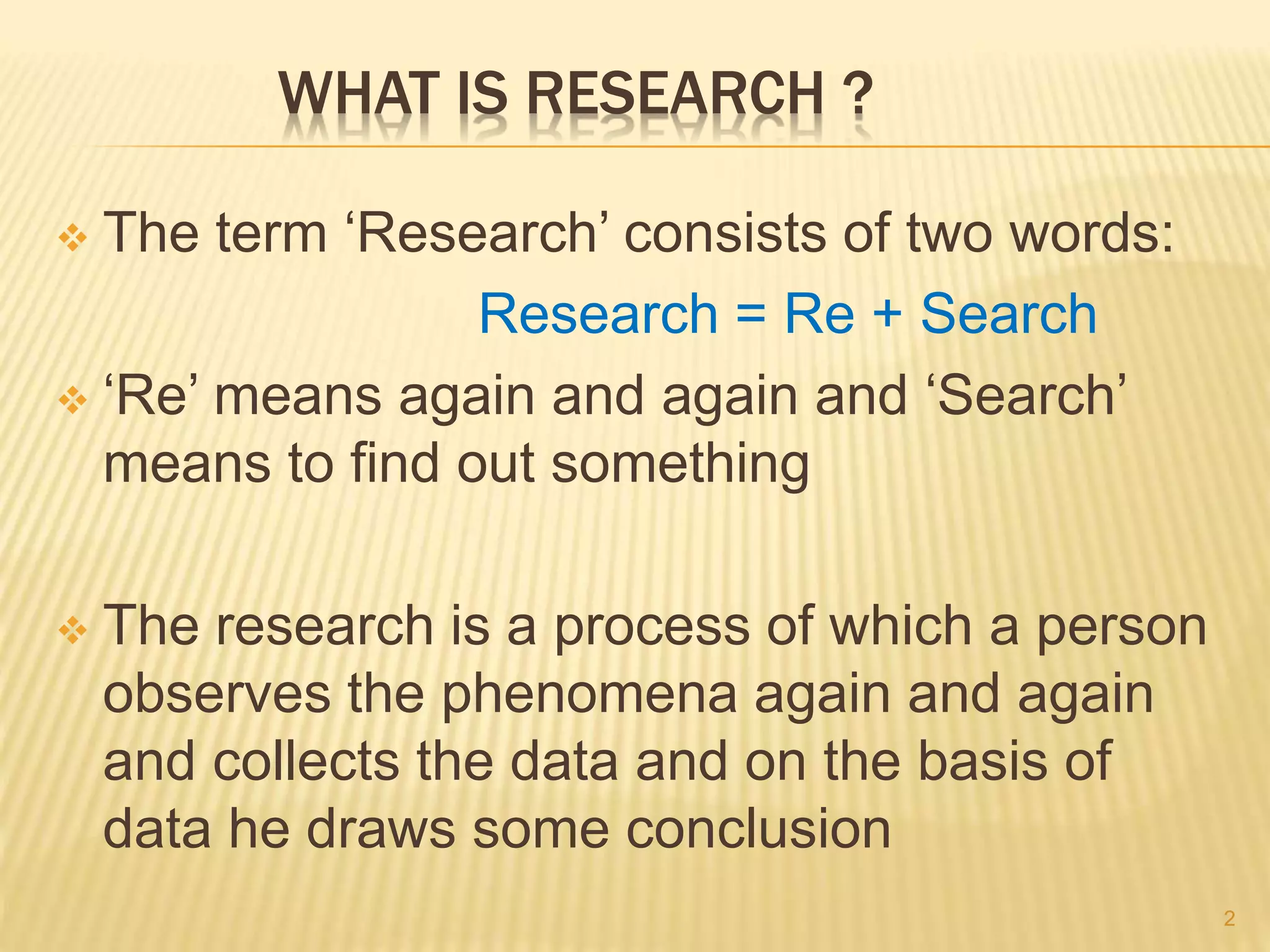 1. The document discusses selecting and formulating a research problem. It defines research as a process of observing phenomena repeatedly to collect data and draw conclusions.