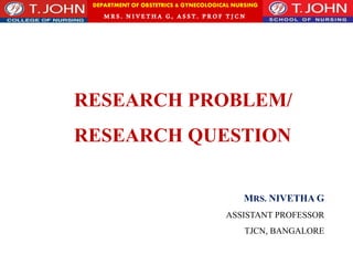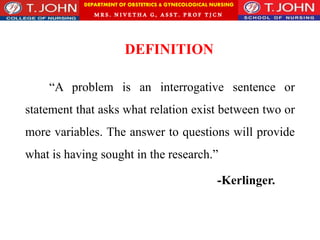 This document discusses research problems and variables in nursing research. It defines a research problem as a question about the relationship between two or more variables. The identification of a research problem is the first step in the research process. Research variables can be independent, dependent, demographic, or extraneous. Independent variables are manipulated by the researcher, while dependent variables are measured outcomes. Demographic variables describe study subjects and extraneous variables are not part of the study but may influence results. The document also discusses formulating research objectives which provide direction for investigating variables.