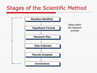 This document discusses research problems and types of variables. It begins by outlining the stages of the scientific method and then describes three types of research questions: descriptive, relationship, and difference questions. Next, it covers criteria for selecting a research problem, such as interest, significance, and manageability. The document defines key terms like research problem, variables, and types of variables. It also discusses formulating a well-defined research problem and outlines components of a research problem statement, including delimitations, limitations, and assumptions.