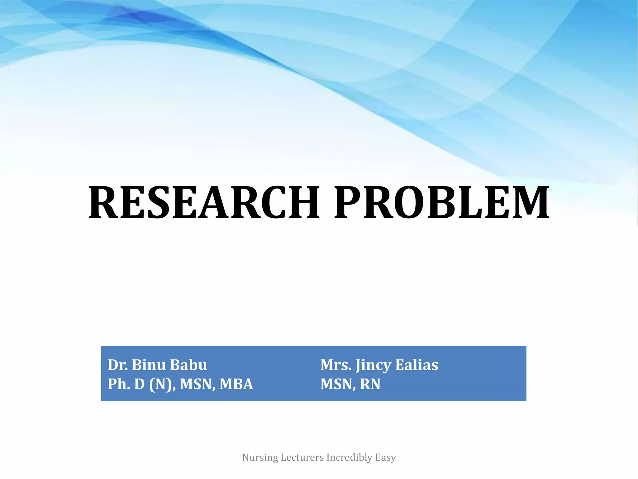 1. A research problem is an issue identified for investigation that arises from experience, literature, theories or social issues. It begins with selecting a broad topic and understanding the nature and relevance of the problem.