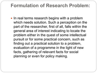 The document discusses the key steps in formulating a research problem and conducting social science research. It explains that research begins by identifying a problem to study, which is then narrowed into a specific research question. The researcher reviews previous literature to learn what is already known about the topic and to help formulate hypotheses. Hypotheses are tentative explanations for relationships between variables that will be tested through empirical research. The goal of clearly defining the research problem, variables, and hypotheses is to guide the researcher and focus the scope of the study.