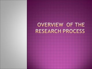 The document outlines the steps in the scientific research process. It discusses 6 phases: conceptual, design and planning, empirical, analytic, and dissemination. The conceptual phase involves identifying the problem, purpose, and reviewing literature. The design and planning phase includes selecting the research design, population, and sample. The empirical phase consists of data collection methods, a pilot study, and collecting data. The analytic phase involves analyzing and interpreting findings. Finally, the dissemination phase communicates the results. The overall purpose of nursing research is to answer questions or solve problems related to the nursing profession.