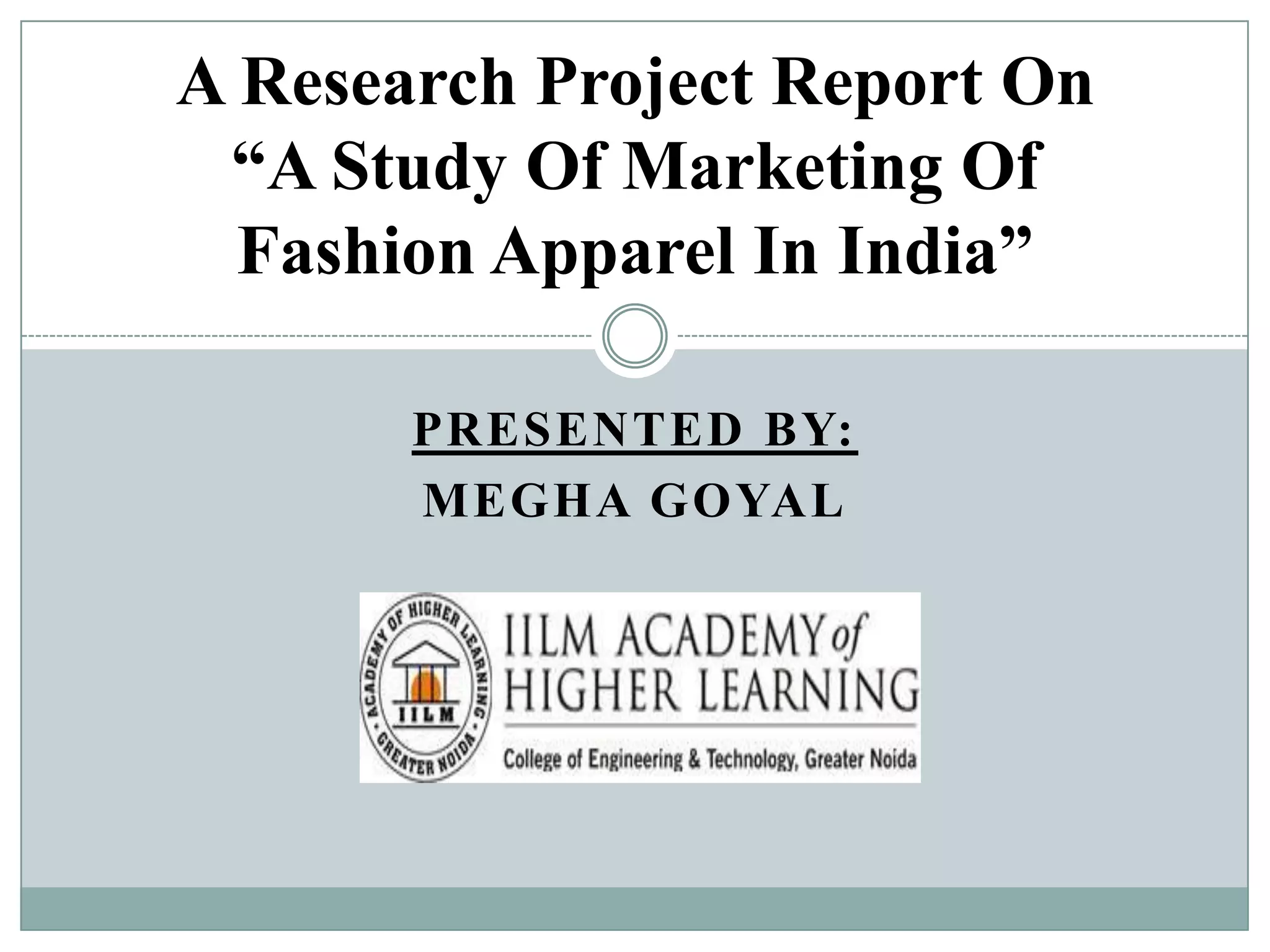 This document presents a research project report on marketing fashion apparel in India. The objectives are to evaluate digital media's effect on fashion marketing, understand demand trends, formulate strategies, and suggest measures. A hypothesis is tested that customers purchase matching outfits. The methodology includes a descriptive study using simple random sampling of 100 respondents. Analysis finds that students are most respondents, friends inspire purchases, and the hypothesis is accepted. Conclusions recommend overcoming ergonomic issues, protecting workers, improving marketing strategies.