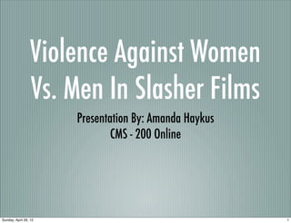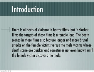 The document summarizes a student's presentation analyzing violence against women in slasher films. The student analyzed the Scream film series, finding that while more male than female victims were shown in most of the films, attack scenes on female victims were significantly longer on average. The student concluded that their hypothesis about longer attacks on female victims versus males was confirmed by the analysis.