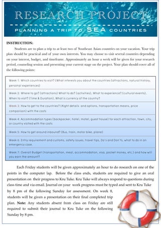 The document outlines a 7-week research project for students to plan a trip to Southeast Asian countries. Each week focuses on a different element of trip planning: Week 1 is choosing countries, Week 2 is attractions and activities, Week 3 is flights and transportation, Week 4 is accommodations, Week 5 is transportation within countries, Week 6 is entry requirements and safety, and Week 7 is budgeting. Students research each element, present their progress each Friday, and submit a journal entry by Sunday for the teacher's feedback and assessment.