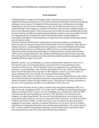This proposal seeks to study the experience of integrating technology for college professors. Past research has focused on K-12 teachers, students, and pre-service teachers, but not college professors. The study will observe and interview two professors at East Stroudsburg University who teach large general education courses. Through interviews and classroom observations, the study aims to understand the professors' technology use, barriers faced, teaching philosophies, and overall experience integrating technology. Key factors that may influence their experiences include the university's aging infrastructure, policies around technology use, differences in their ages and education backgrounds, and positions on the innovation adoption curve. The goal is to gain new perspectives on what the technology integration experience is like for college professors.