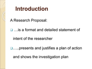 The document provides guidance on drafting a research proposal. It discusses the key elements of a research proposal including an introduction, literature review, methodology, expected results, budget, and bibliography. It emphasizes that a proposal establishes the researcher's plan of action and investigation and justifies the need for the study. A good proposal convinces readers that the proposed research is important and the methodology is sound.