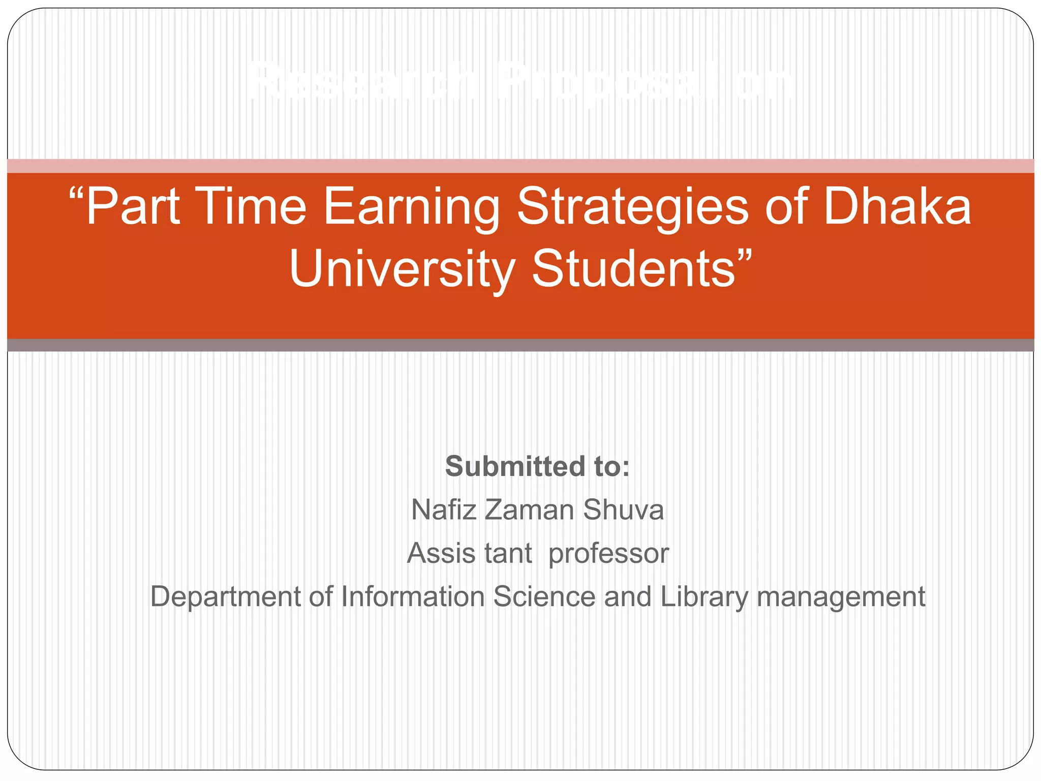 This document outlines a research proposal that will study the part time earning strategies of Dhaka University students. The proposal includes an abstract, introduction, objectives, literature review, hypotheses, research questions, research design, data analysis plan, anticipated timeline and budget, and ethical considerations. The study aims to survey 200 students from each of the university's four faculties about their current part time employment preferences and needs, and to identify new employment opportunities and training that could be provided.