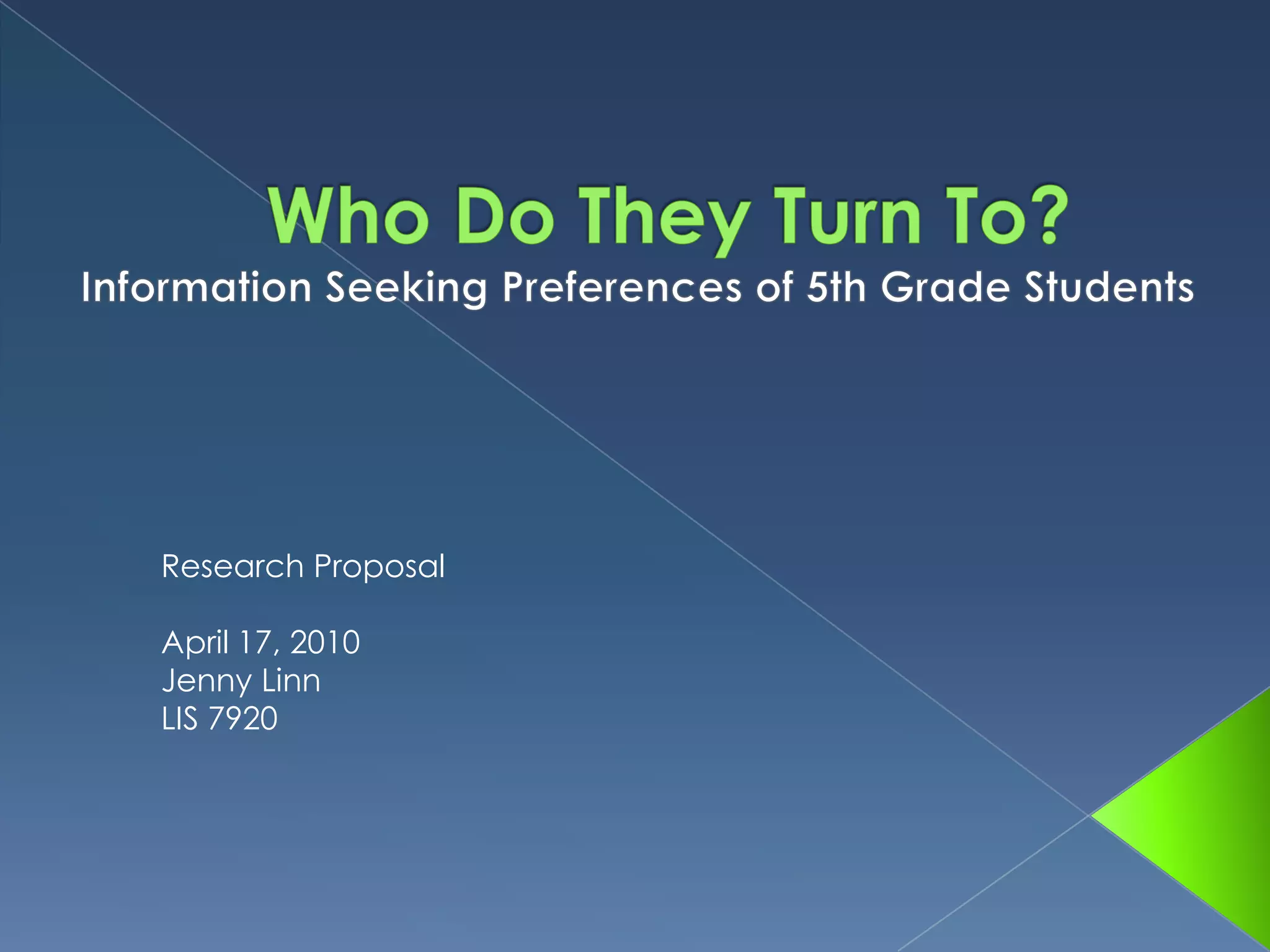 This document summarizes a research proposal that aims to study the information seeking preferences of 5th grade students. Specifically, it seeks to understand who students turn to for help, why they prefer certain sources over others, and the general characteristics of their information seeking behavior. The methodology will involve qualitative interviews with 5th grade students. Adjustments to the research plan are noted, including adding questions about preferences and using multiple data collection methods. The discussion questions posed focus on the best use of a librarian's time to teach information literacy and how to make librarians more visible to students.