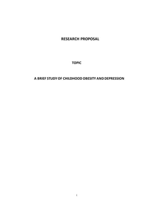 This research proposal examines the relationship between childhood obesity and depression. The study will administer the Childhood Depression Inventory (CDI-2) to 29 children to assess their depression levels and correlate these results with each child's weight, activity level, and other health metrics. The proposal acknowledges the physical and psychological impacts of childhood obesity and aims to clarify how obesity may relate specifically to depression in young children. The significance is understanding this relationship could help identify at-risk children and improve outcomes. The methodology section describes a quantitative survey distributed to healthcare providers to understand current practices for monitoring and treating childhood obesity in Montana.