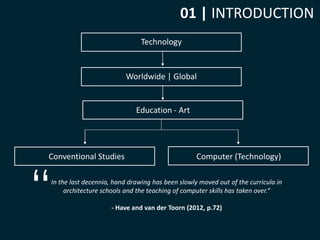 This document proposes research on students' preferences for using computer software or hand drawing in design works. The research would use quantitative methods like experiments, tests, and questionnaires to identify students' interests and determine if there are differences between preferences for computer software versus hand drawing. It would also investigate which tools are most important for meeting real industry needs based on factors like productivity, quality of work, and time management. The literature review will examine the history and roles of hand drawing and computer-aided design in art education and industry.