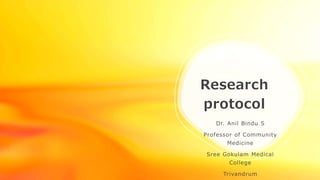 This document outlines the key components of a research protocol, including identifying a health problem, formulating research questions and objectives, planning data collection and analysis, and drawing conclusions. It discusses that a research protocol provides a formal written plan and blueprint for conducting research. The major sections covered are introduction, research question/hypothesis, objectives, review of literature, materials and methods, sample size calculation, data collection plan, data analysis plan, implementation plan, ethical considerations, timeline, and references. The goal of a protocol is to clarify the research question and design a scientifically sound methodology to properly address the question.