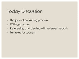 This document provides guidance on publishing academic work in international journals. It discusses deciding where to publish based on factors like journal scope and impact factor. The publishing process involves submitting manuscripts that undergo peer review. Authors should address reviewer feedback by revising manuscripts. Key steps include having strong introduction/methods/results/discussion sections and responding fully to all reviewer comments in the revision. Following best practices like selecting appropriate journals and carefully addressing reviews can help authors succeed in publishing their work.