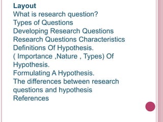 This document discusses research methodology, specifically focusing on research questions and hypotheses. It defines what a research question is and discusses the different types of research questions. It also defines what a hypothesis is, discusses the importance and nature of hypotheses, and types of hypotheses. It provides guidance on formulating research questions and hypotheses, including characteristics of good research questions and how hypotheses vary based on whether a study is qualitative or quantitative. Finally, it outlines the key differences between research questions and hypotheses.