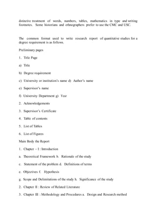 This document discusses the importance of writing research reports and summarizing the research process. It outlines different types of research reports, including theses, dissertations, journal articles, and papers for professional meetings. Theses and dissertations are more elaborate, while journal articles and papers are more concise. The document also discusses format and style guidelines, noting that reports generally follow the research process steps and reference style manuals like APA or Chicago for formatting rules. Common report sections are outlined for quantitative, qualitative, and article/paper-style reports.
